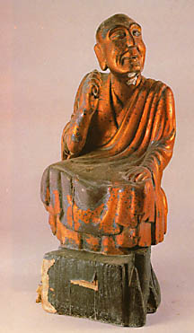 Lohan esculpido en madera que se encuentra en el Monasterio de Nan Hua Si, fundado en el año 675 a. C. por Hui Neng, el Sexto y Último Patriarca Zen. El Monasterio fue renovado paulatinamente durante la dirección sacerdotal del Maestro Han Shan en el siglo dieciséis. |